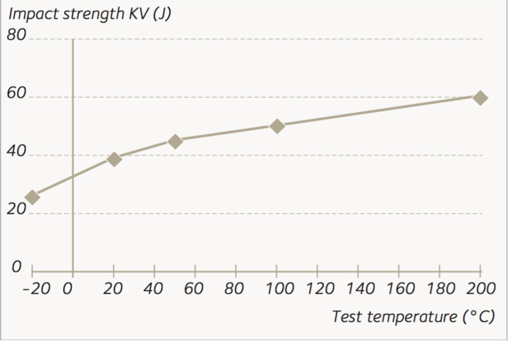 Resistencia al impacto KCV en dirección longitudinal para un pretemplado 400 HB, de 100 mm de espesor (4”).