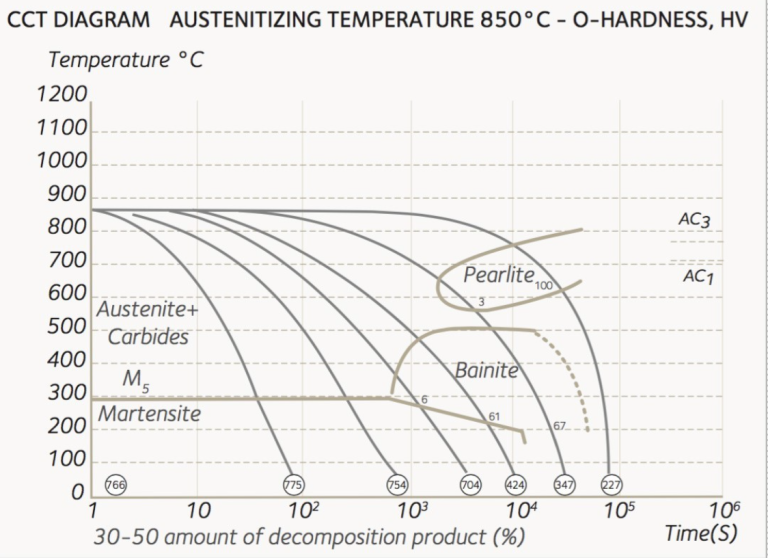 - Medios de enfriamiento: aceite o aire dependiendo del espesor (ver diagrama CCT a continuación). Gas de alta velocidad o atmósfera circulante.